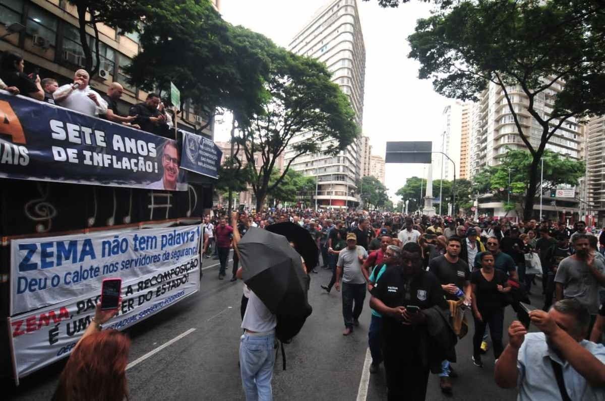 Agentes das forças de Segurança Pública de Minas Gerais fazem protesto pela recomposição salarial no Centro de Belo Horizonte na tarde desta quinta-feira (22/2). Com o governador Romeu Zema (Novo) como alvo, membros das polícias Penal, Civil e Militar, além de bombeiros e agentes socioeducativos, cobram 41% de reajuste. O número é calculado a partir das perdas inflacionárias desde 2015 subtraindo os dois únicos aumentos nos vencimentos concedidos pelo estado desde a data.