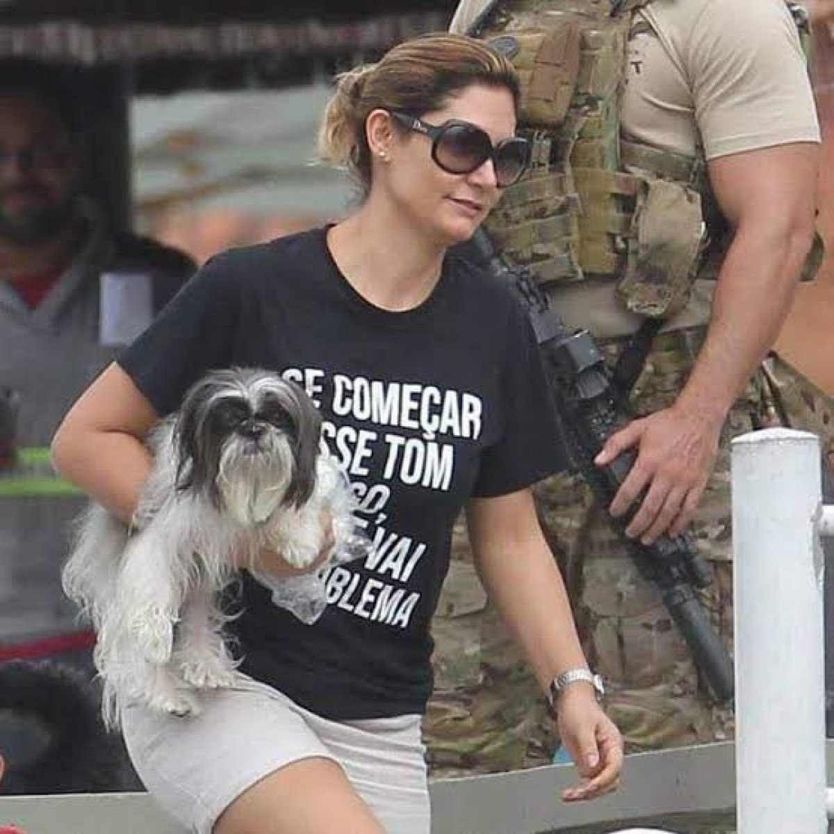 Em 2018, quando ainda era futura primeira-dama, Michelle Bolsonaro, desembarcou em Itacuruçá (RJ) carregando o cachorro da família e vestindo uma camiseta com a frase: "Se começar nesse tom comigo, a gente vai ter problema". A estampa fazia referência a uma frase dita pela juíza Gabriela Hardt ao então ex-presidente Luiz Inácio Lula da Silva, durante o depoimento prestado por ele à Justiça de Curitiba. Gabriela Hardt era a sucessora de Sérgio Moro nas ações penais da operação Lava-Jato.