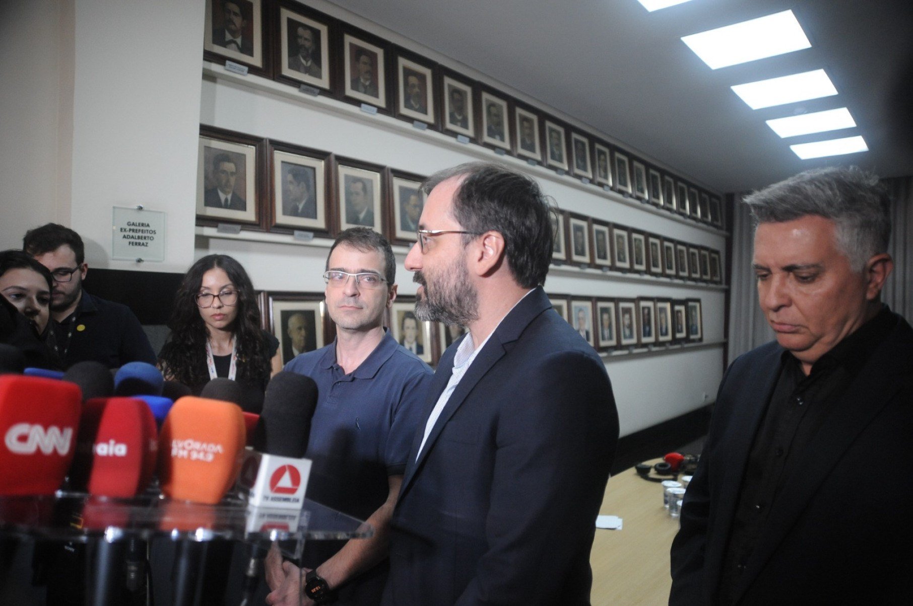 Gustavo (dir) e Paulo Henrique (centro) estiveram com o agora prefeito Álvaro Damião (União Brasil) em coletiva no velório de Fuad Noman - (crédito: Alexandre Guzanshe/EM/D.A Press)