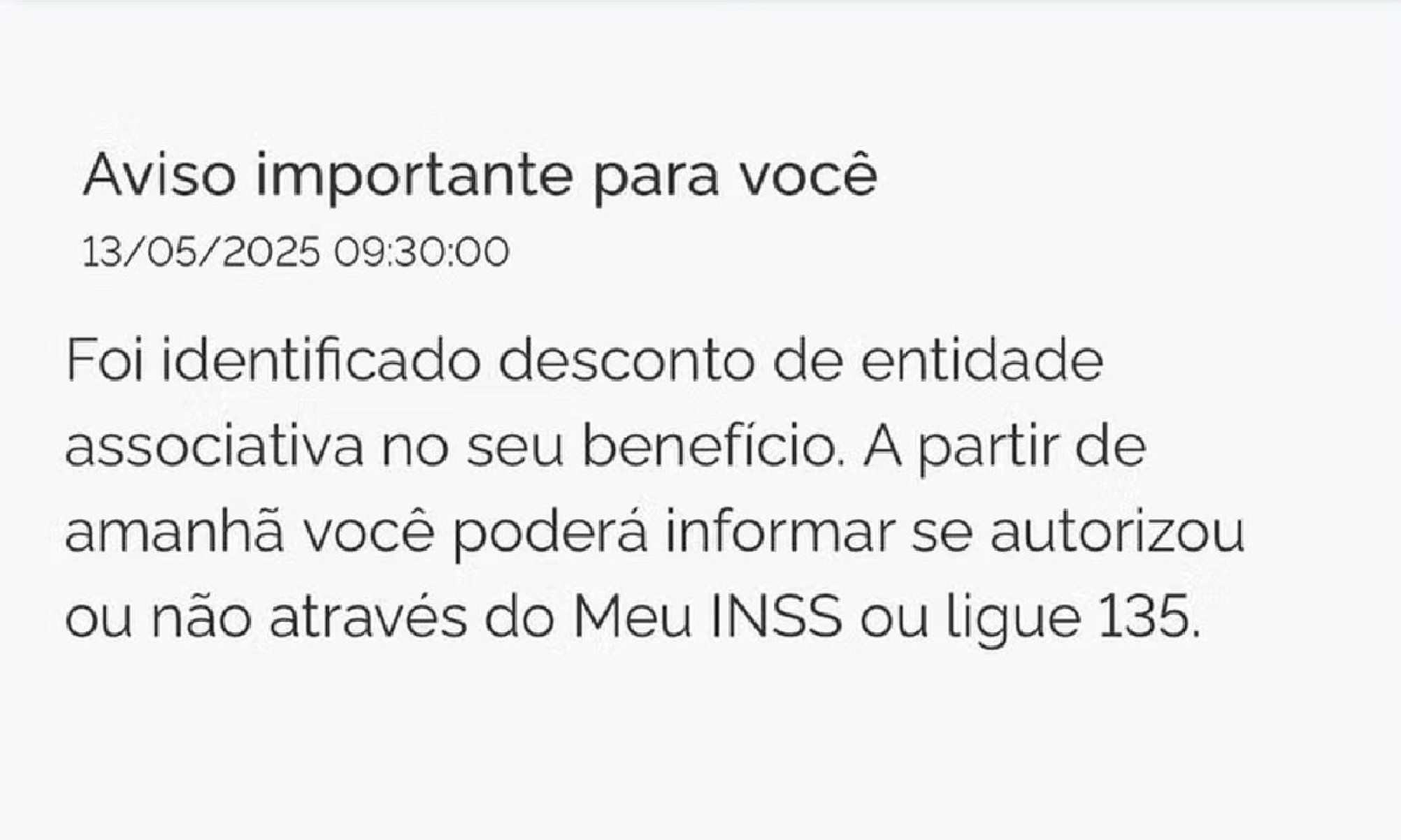 O instituto também está notificando os benefícios que não tiveram descontos identificados, com a seguinte mensagem: “Aviso importante para você. Foi identificado desconto de entidade associativa em seu benefício. A partir de amanhã você poderá informar se autorizou ou não através do Meu INSS ou ligue 135."
