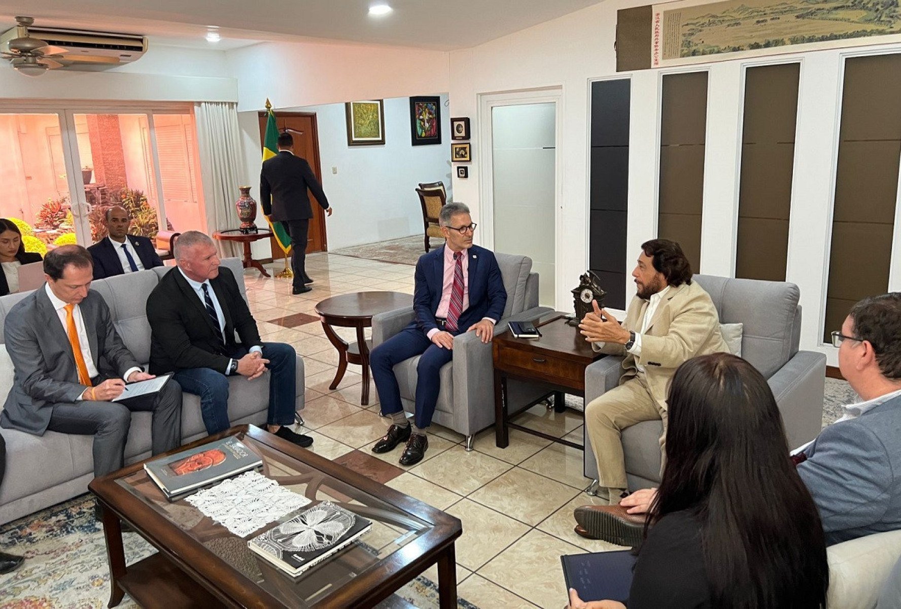 Durante viagem oficial a El Salvador, o governador Romeu Zema (Novo) se encontrou, nesta quarta-feira (28/5), com o vice-presidente do país, Félix Ulloa. Também participaram da reunião o secretário de Justiça e Segurança Pública (Sejusp), Rogério Greco, o secretário de Comunicação Social (Secom), Bernardo Santos, e o superintendente de relações nacionais e internacionais da Secretaria de Casa Civil (SCC), Igor Tameirão.