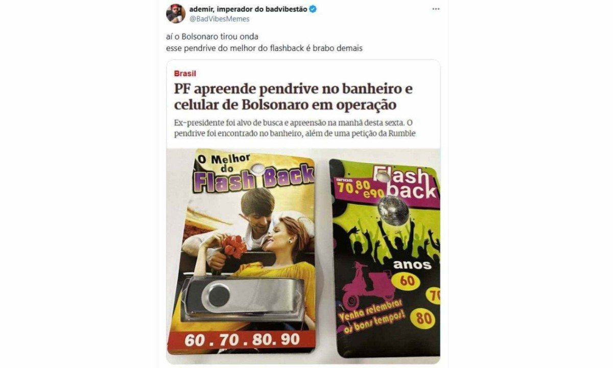 Siga noDurante a operação realizada pela Polícia Federal na manhã desta sexta-feira (18/7), em Brasília, um detalhe chamou atenção: um pen drive foi encontrado escondido no banheiro da casa do ex-presidente Jair Bolsonaro (PL). Em coletiva à imprensa, Bolsonaro afirmou desconhecer o item e criticou o fato de a apreensão ter ocorrido em um cômodo tão íntimo. Nas redes sociais, o achado rapidamente virou piada.