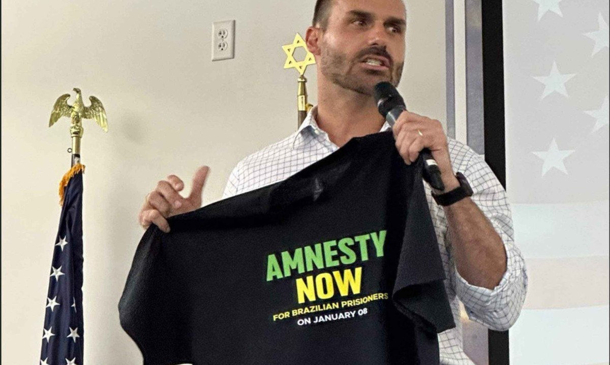“Não haverá recuo. Venceremos!”, acrescentou o deputado. Nas fotos compartilhadas, o filho 03 de Bolsonaro exibe uma blusa com a frase “Amnesty now for brazilian prisoners on january 08” (Anistia já para os presos brasileiros do 8 de janeiro).