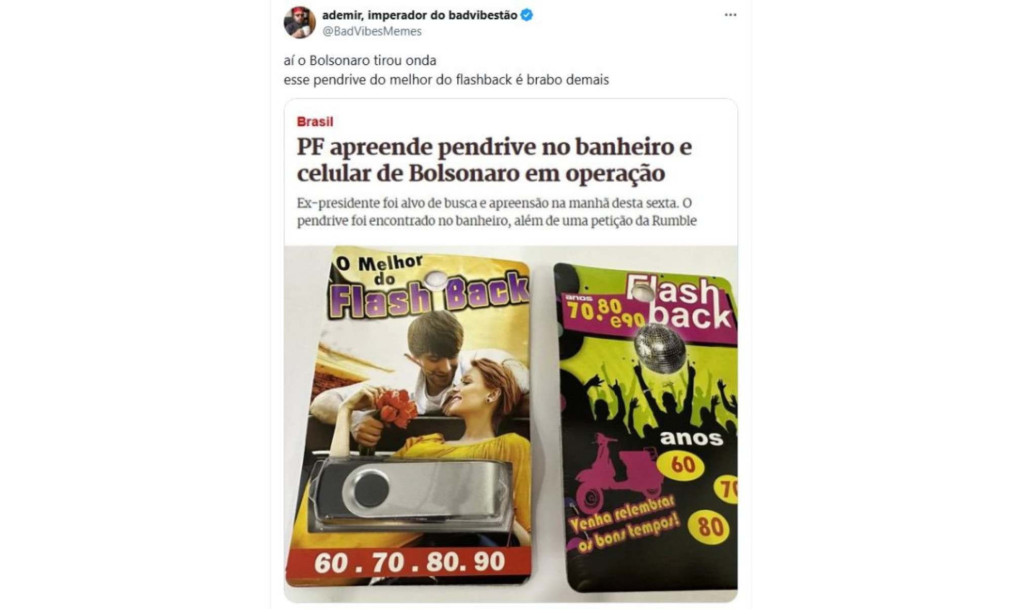 Diversos perfis ironizaram o esconderijo incomum e especularam sobre o conteúdo do dispositivo. “Pen drive escondido no banheiro… nem a vilã mais burra do Walcyr faria isso”, brincou uma internauta. Outros pediram com humor para que o conteúdo fosse “pornografia”, enquanto alguns duvidaram que Bolsonaro teria deixado provas comprometedoras num local tão óbvio. Veja algumas publicações: