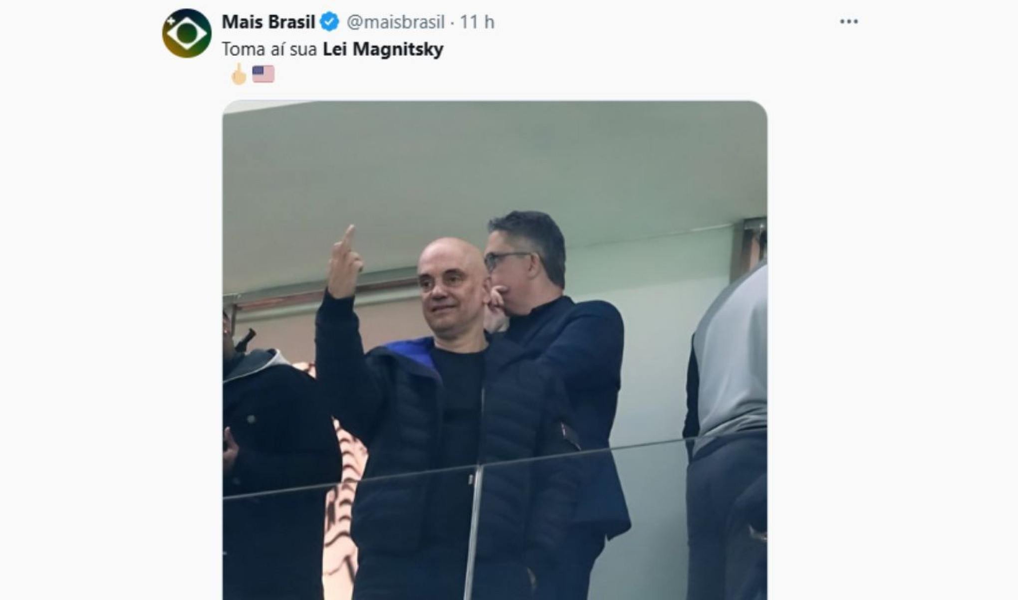 “Eu tenho zero problema em pagar o almoço do Alexandre de Moraes, caso ele não possa mais usar Alelo”, disse outro, citando o vale refeição. A ida do ministro ao jogo do Corinthians também foi elogiada. “Alexandre de moraes hoje: chegou de mãos dadas com a esposa no jogo do corinthians; viu a vitória do time contra o maior rival; nem se importou com a lei magnitsky. O craque do jogo”, brincou um perfil. Veja mais: