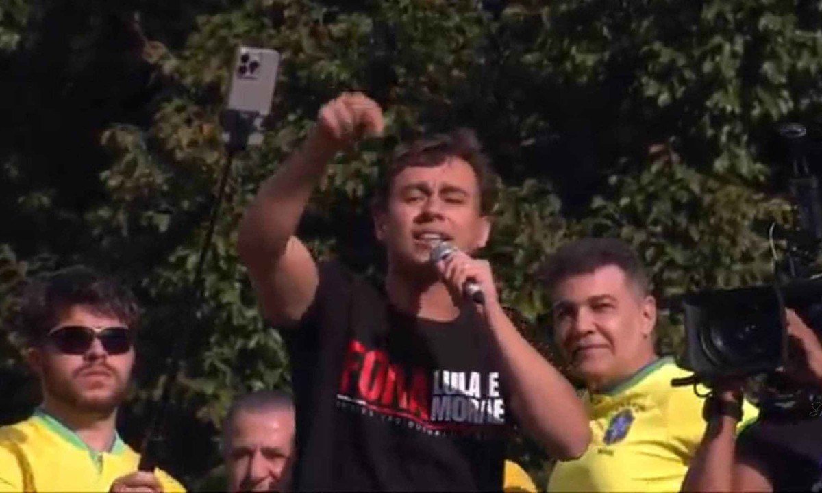 Com a ausência do ex-presidente, Nikolas fez chamada de vídeo com Bolsonaro e o chamou de "galego mais amado do Brasil" durante ato na Avenida Paulista