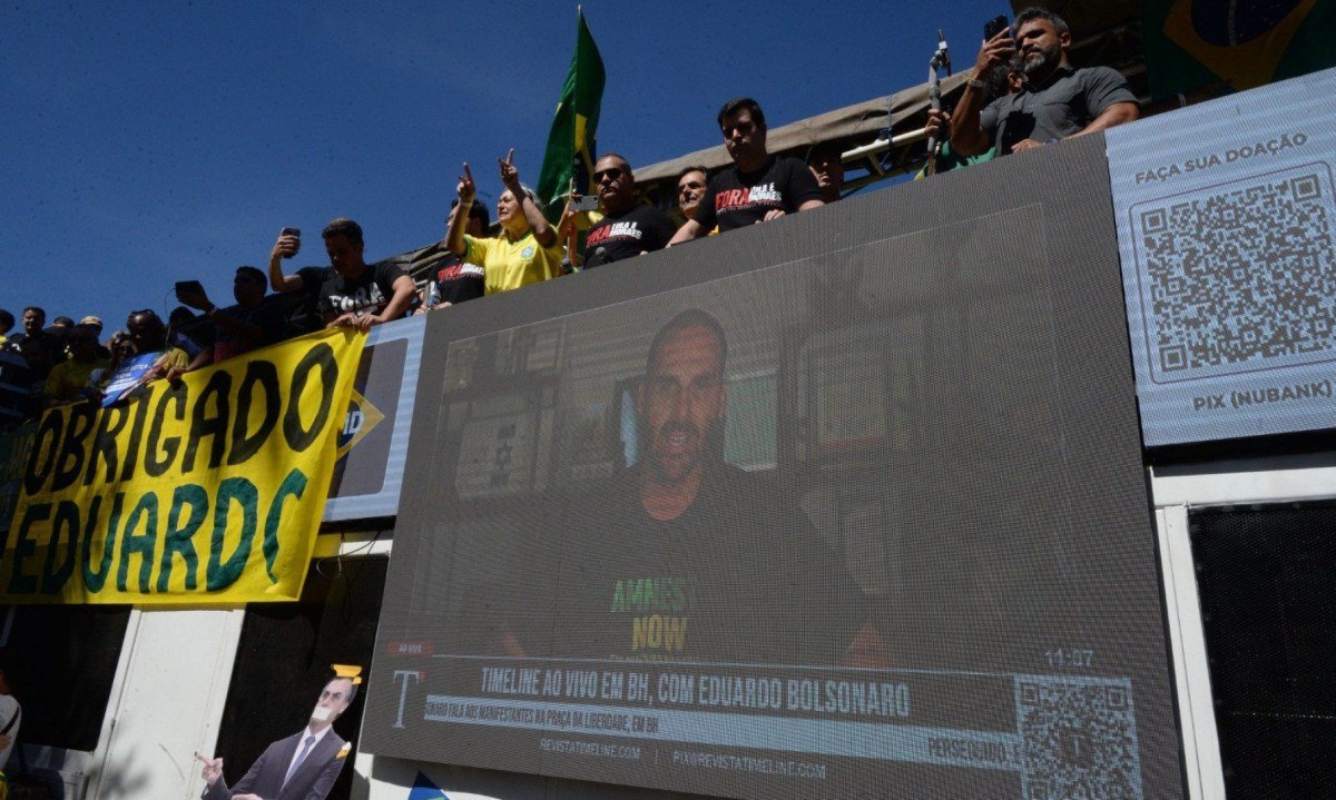 Manifestação reuniu aliados do ex-presidente na Praça da Liberdade; Eduardo Bolsonaro participou de chamada de vídeo com críticas a Moraes