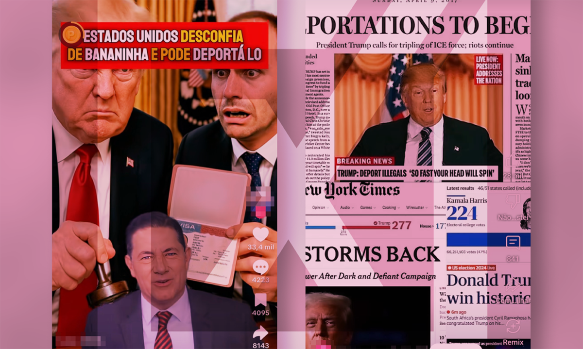 Um dos vídeos, divulgado no TikTok, traz ainda como elementos de uso de IA imagens de Trump com semblante furioso e um carimbo na mão em frente a um homem com feições semelhantes a Eduardo Bolsonaro e aspecto assustado, de posse de um passaporte. A imagem é exibida em uma montagem em uma suposta capa do The New York Times.
