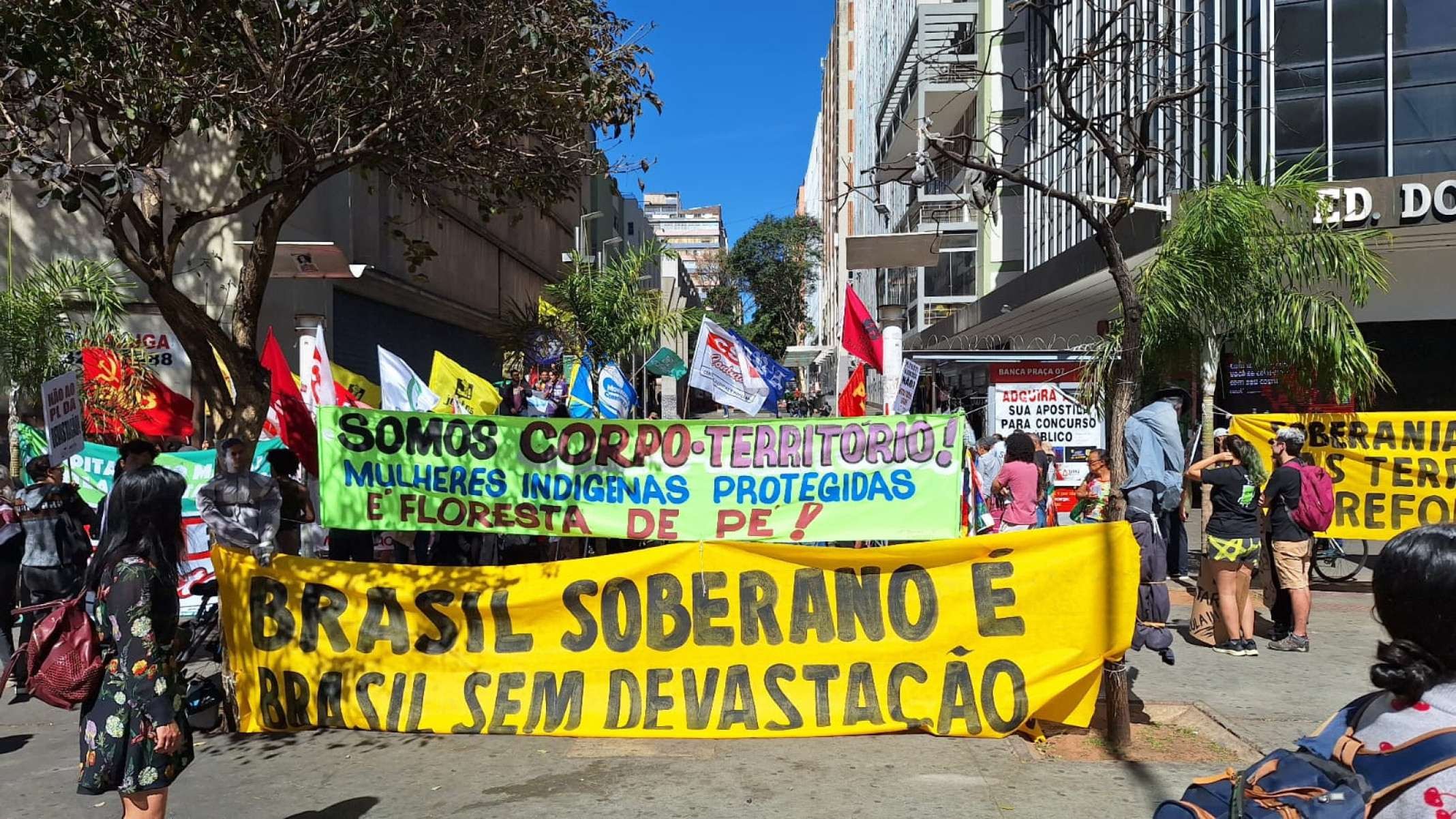 Entre os cartazes exibidos na manifestação, frases como “Brasil soberano é Brasil sem devastação”, “Somos corpo-território! Mulheres indígenas protegidas e floresta de pé!” e “Congresso inimigo do povo e da Mãe Terra. PL da Devastação, não” sintetizam o tom do protesto.