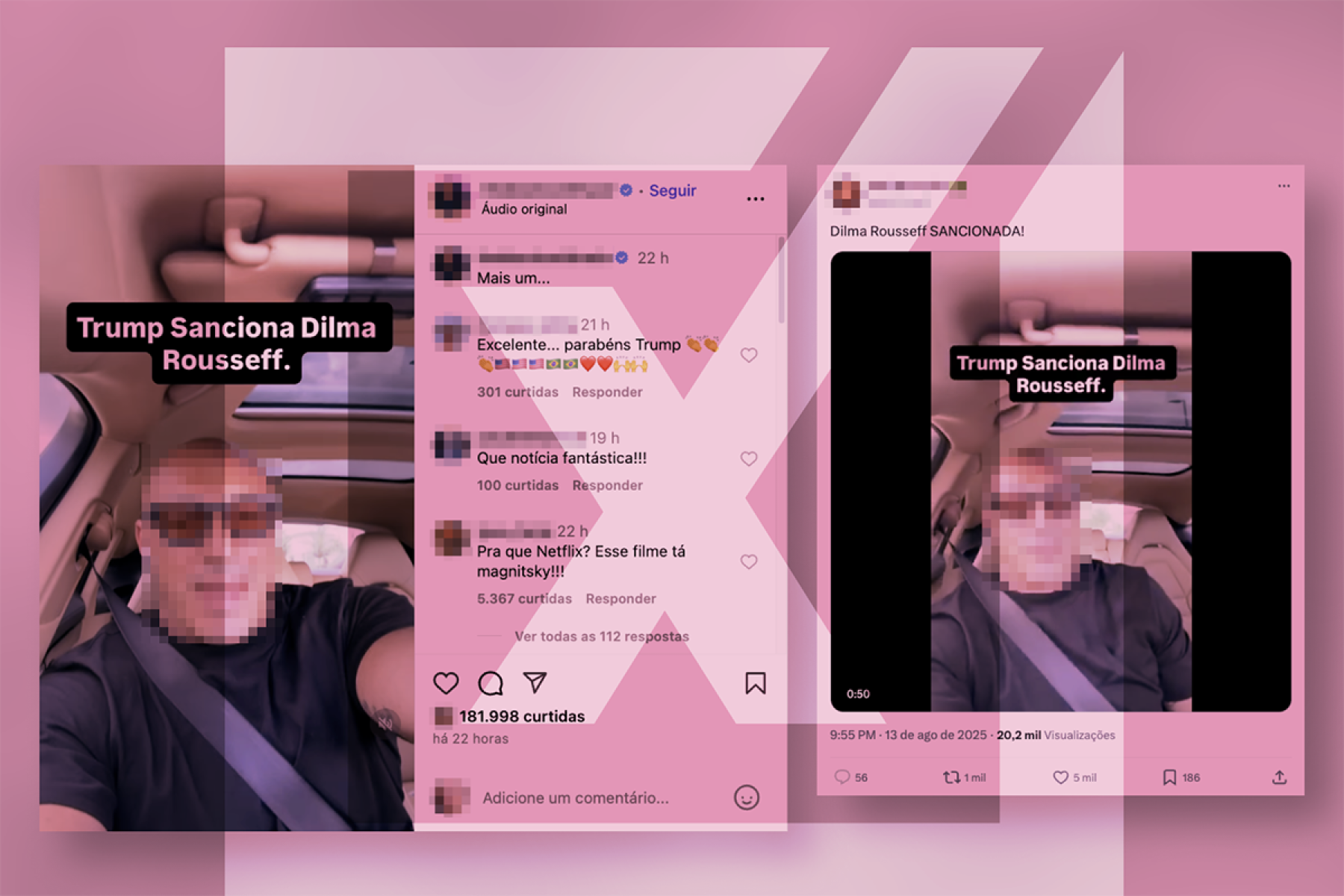 As postagens trazem um vídeo que mostra um homem em um carro, com a legenda “Trump Sanciona Dilma Rousseff” e alegam que Dilma estaria entre as autoridades sancionadas por ter participação no programa Mais Médicos.