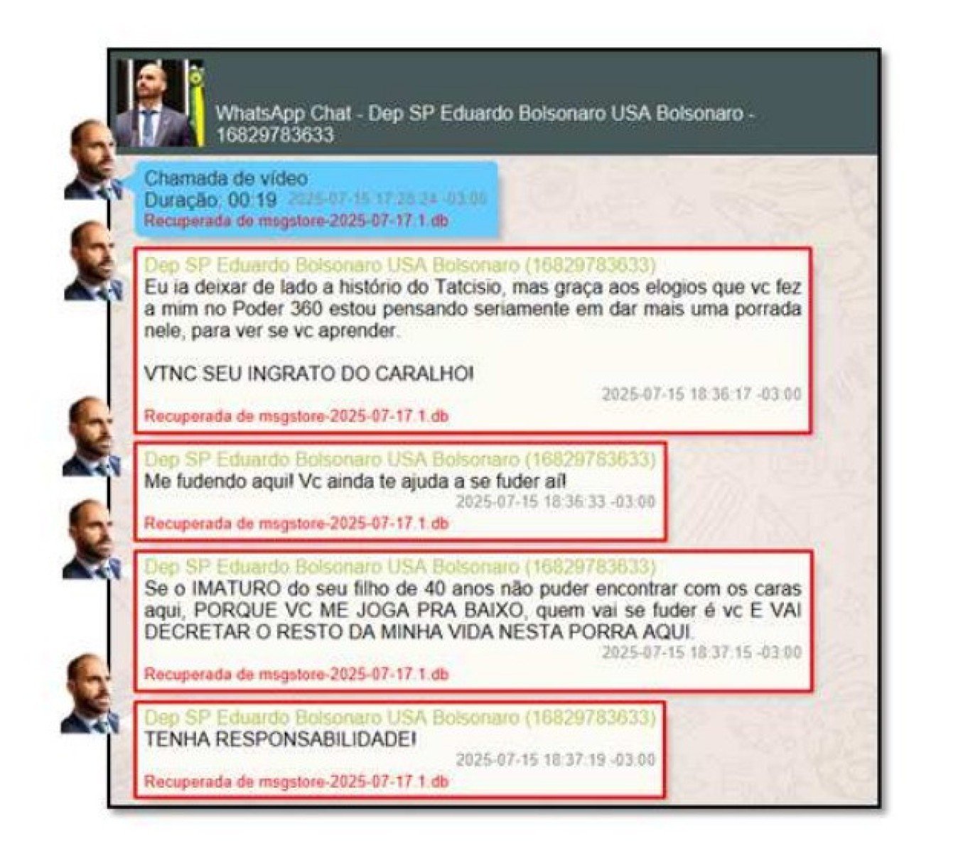 O filho "03" pede, em letras maiúsculas, que o pai tenha responsabilidade. Os dois trocaram três mensagens que não foram recuperadas pela PF. Ao que Eduardo Bolsonaro pede para que ele seja tratado pelo pai como ele trata o ex-presidente Michel Temer (MDB).