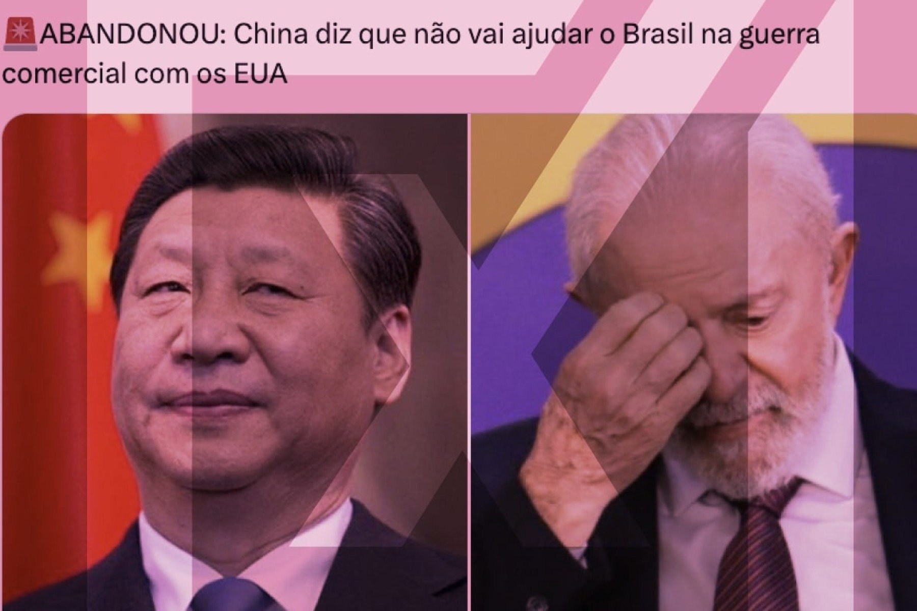 Não há registro público de que a China tenha declarado que “não vai ajudar o Brasil na guerra comercial com os EUA”, ao contrário do que afirma post viral da rede social X. A publicação simula uma notícia jornalística, mas não cita nenhuma fonte para sustentar a alegação.