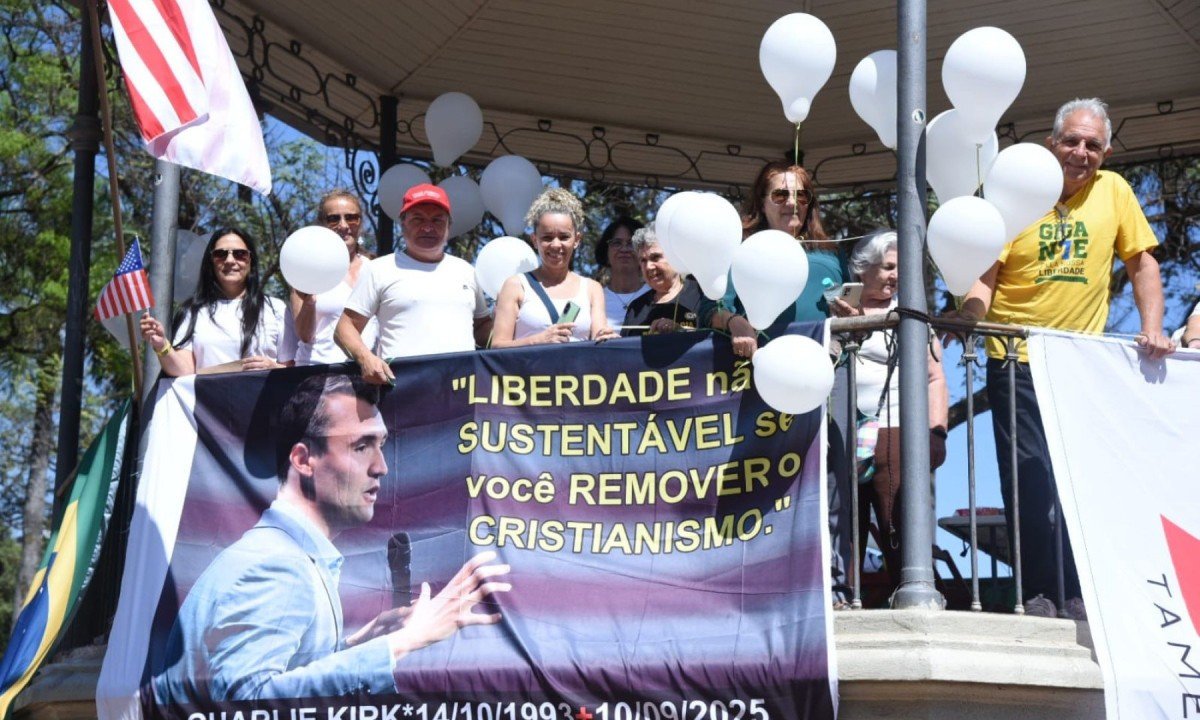 Paralelamente ao funeral, em Belo Horizonte, manifestantes levaram bandeiras do Brasil, balões brancos e cartazes com frases atribuídas ao influenciador de direita. Para eles, a homenagem era uma forma de se unir simbolicamente ao funeral nos Estados Unidos.