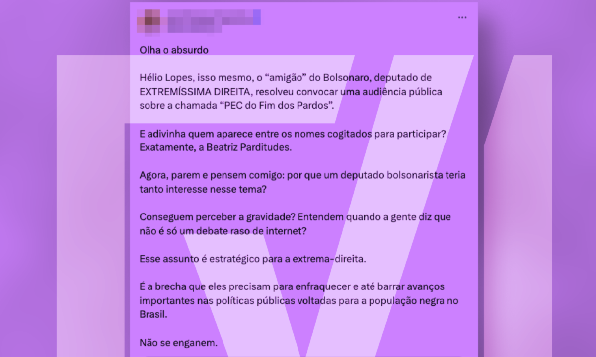 Na mesma linha, surgiram publicações nas redes sociais alegando que a PEC “aniquilaria” a população mestiça e que não garantiria a ela direito a indenizações e acesso ao fundo e a cotas raciais. O temor levantado é de que hoje o país conta com 45,3% de pardos e 10,2% de pessoas pretas, segundo o Censo de 2022, e que no momento em que o fundo considera todos como negros, a população parda seria excluída de programas sociais.