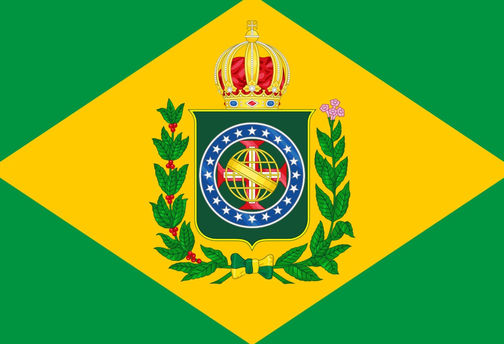 Desenhada pelo pintor francês Jean-Baptiste Debret, a bandeira trazia o retângulo verde da Casa de Bragança, o losango amarelo associado à Casa de Habsburgo, a esfera armilar e a cruz de Cristo remetendo a Portugal, além de ramos de café e tabaco, produtos centrais da economia da época, cultivados pela mão de obra escravizada. No topo, a coroa simboliza a monarquia. Em novembro de 1889, ela foi substituída por decreto do marechal Deodoro da Fonseca.