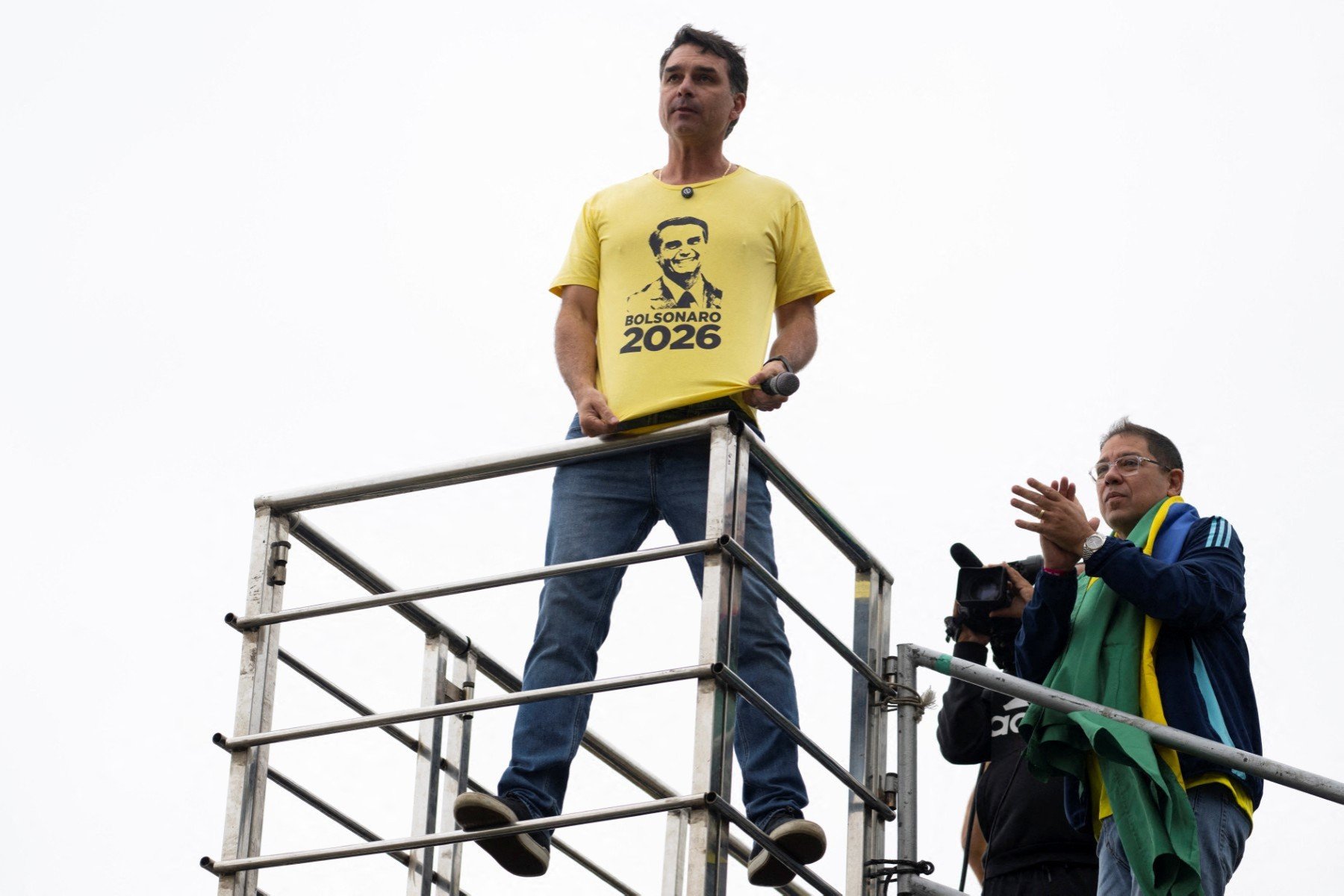 Flávio Bolsonaro também defendeu que o projeto de anistia em discussão no Congresso inclua o ex-presidente. "O texto que nós vamos apresentar para que seja aprovado na Câmara e depois no Senado vai ser para anistiar todos aqueles que são perseguidos. Nós não vamos admitir uma anistia que não atenda também o presidente Bolsonaro. Anistia não é sobre pessoas, é sobre fatos. A farsa é tão generalizada que todos são acusados de cometer os mesmos atos ao mesmo tempo e na mesma proporção", afirmou.