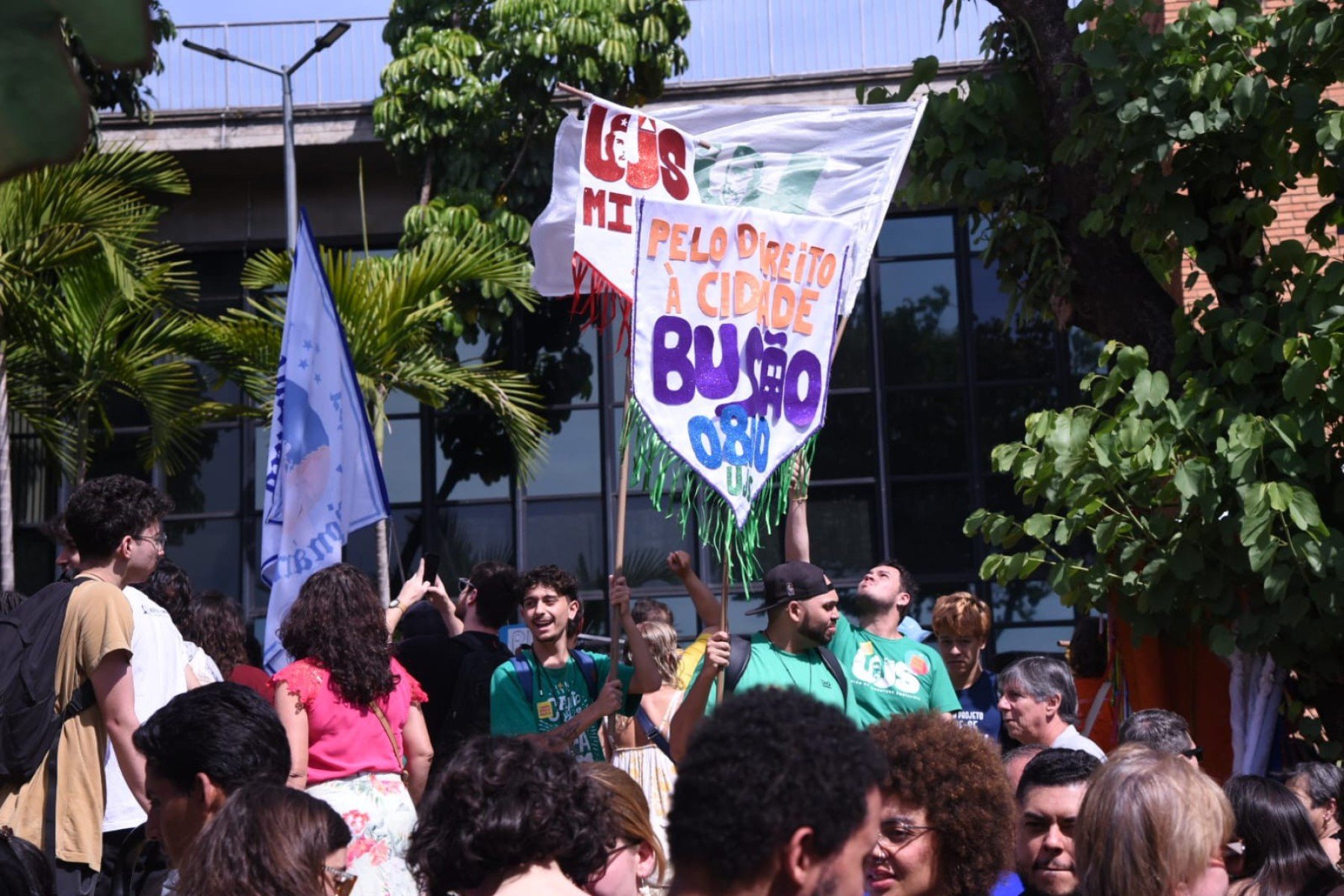 Manifestantes a favor do PL 60/2025, que busca garantir a gratuidade do transporte coletivo por ônibus em Belo Horizonte, se reúnem em frente à Câmara Municipal da capital na tarde desta sexta-feira (3/10). Os apoiadores do Tarifa Zero ocuparam a entrada principal da sede do Legislativo belo-horizontino com cartazes e batuques de Carnaval. A manifestação precede a votação em primeiro turno do texto.