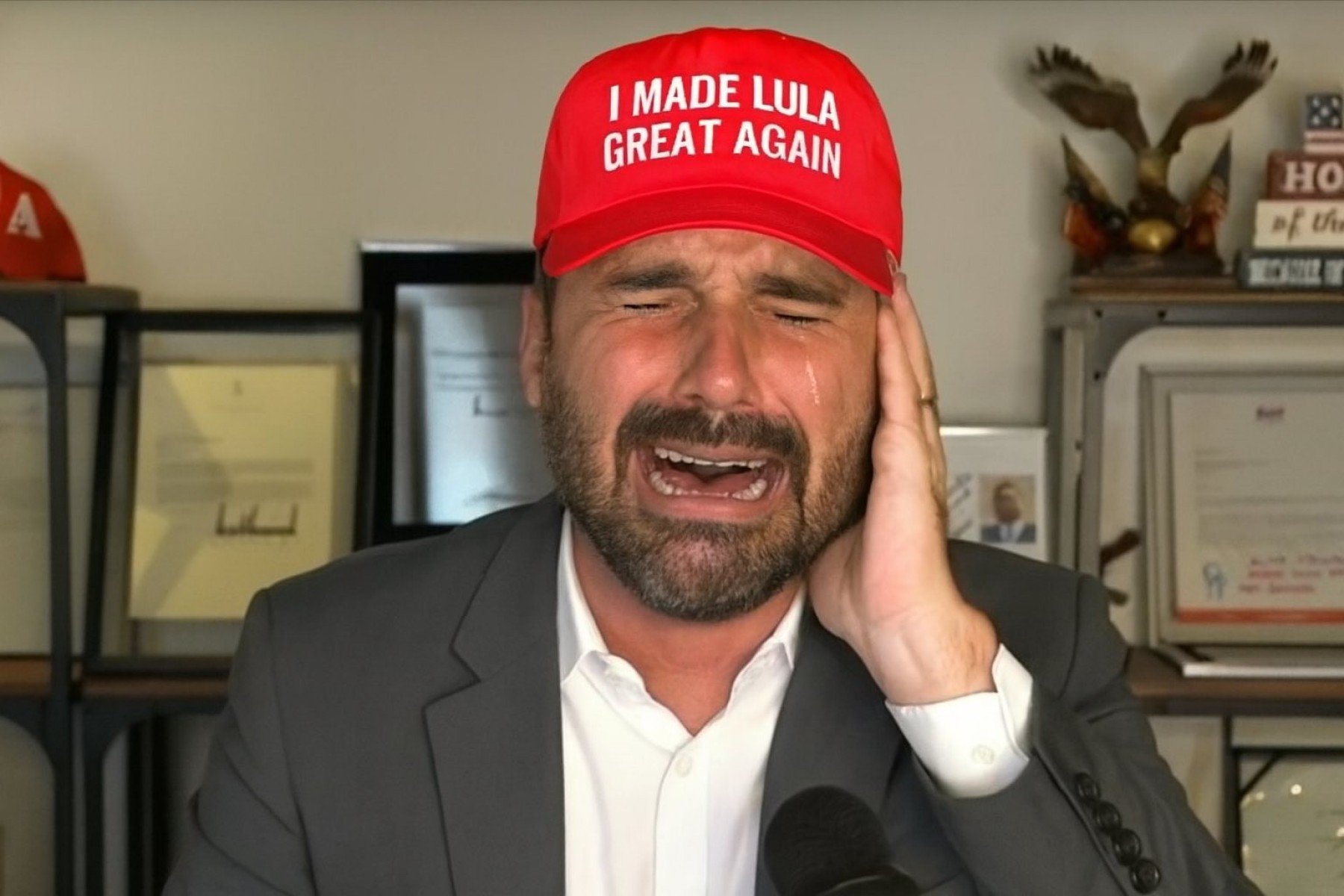 O humorista Danilo Gentili ironizou o deputado federal Eduardo Bolsonaro (PL-SP) nas redes sociais ao chamá-lo de “camisa 10 do Lula”. A provocação foi publicada nessa segunda-feira (13/10) no X (antigo Twitter), acompanhada de uma imagem gerada por inteligência artificial em que o parlamentar aparece chorando e usando um boné vermelho com a frase “I made Lula great again”, uma referência ao lema do presidente dos Estados Unidos, Donald Trump (Republicano), “Make America Great Again”.