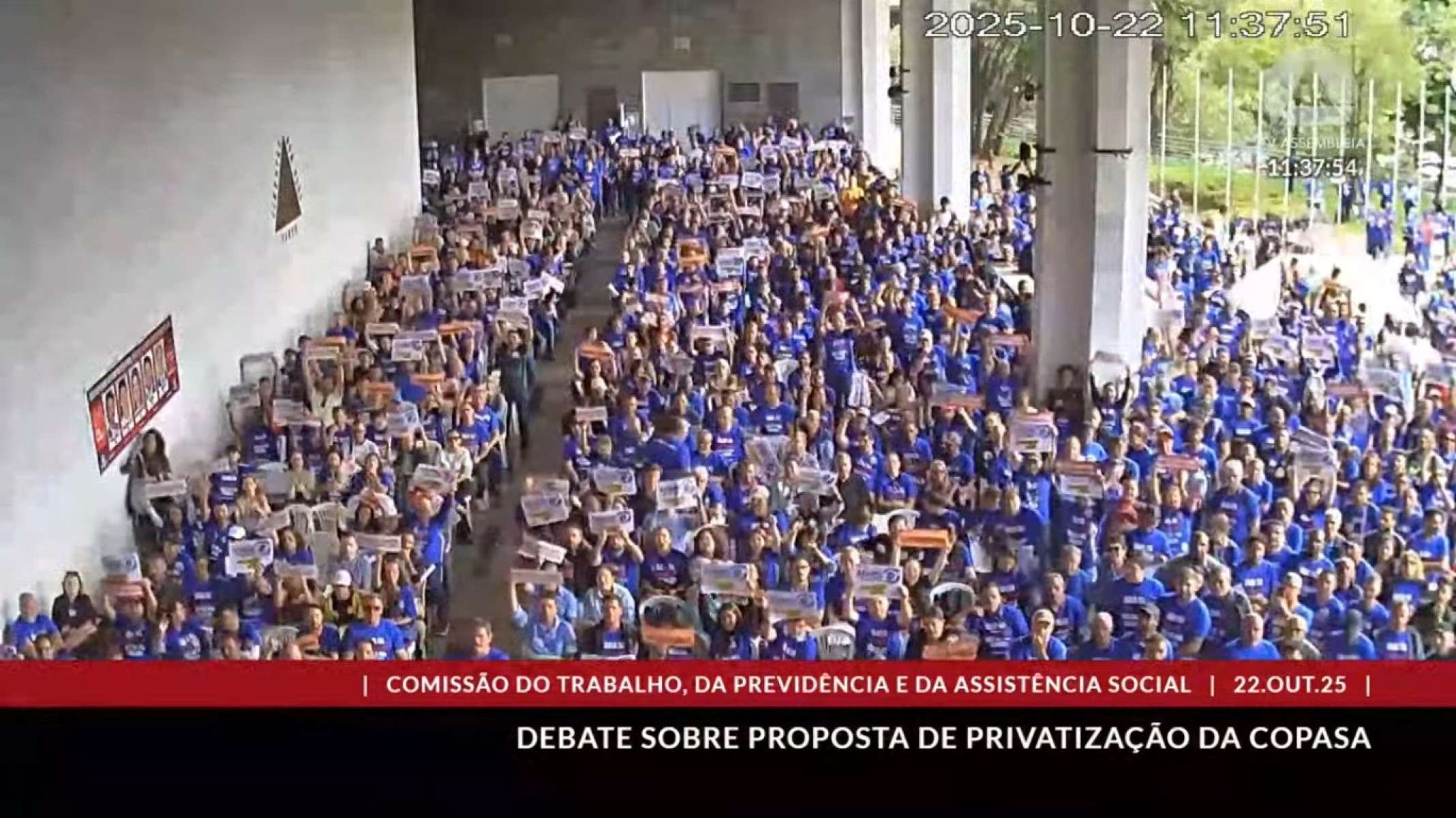 Milhares de funcionários da Companhia de Saneamento de Minas Gerais (Copasa) lotaram, nesta quarta-feira (22/10), o Auditório José Alencar e o hall principal da Assembleia Legislativa de Minas Gerais (ALMG) em protesto contra a proposta do governo Romeu Zema (Novo) que prevê a privatização da companhia de saneamento. O ato ocorre durante uma audiência pública promovida pela Comissão de Trabalho, da Previdência e da Assistência Social, que debate os impactos da medida.