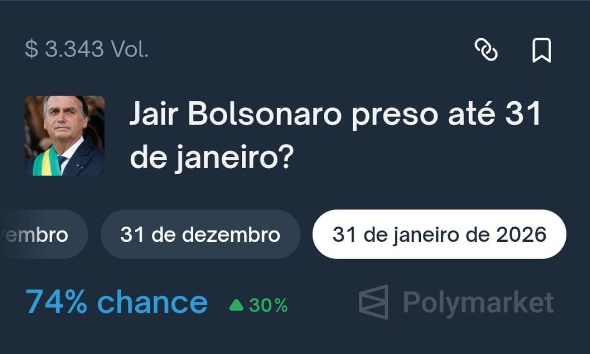 Para os apostadores, a maior probabilidade (74%) é que o ex-presidente seja preso até essa data. Outros 67% apostaram que ele pode ser levado para a prisão até 31 de dezembro, e apenas 13% acreditam que ele seja preso até o fim deste mês.