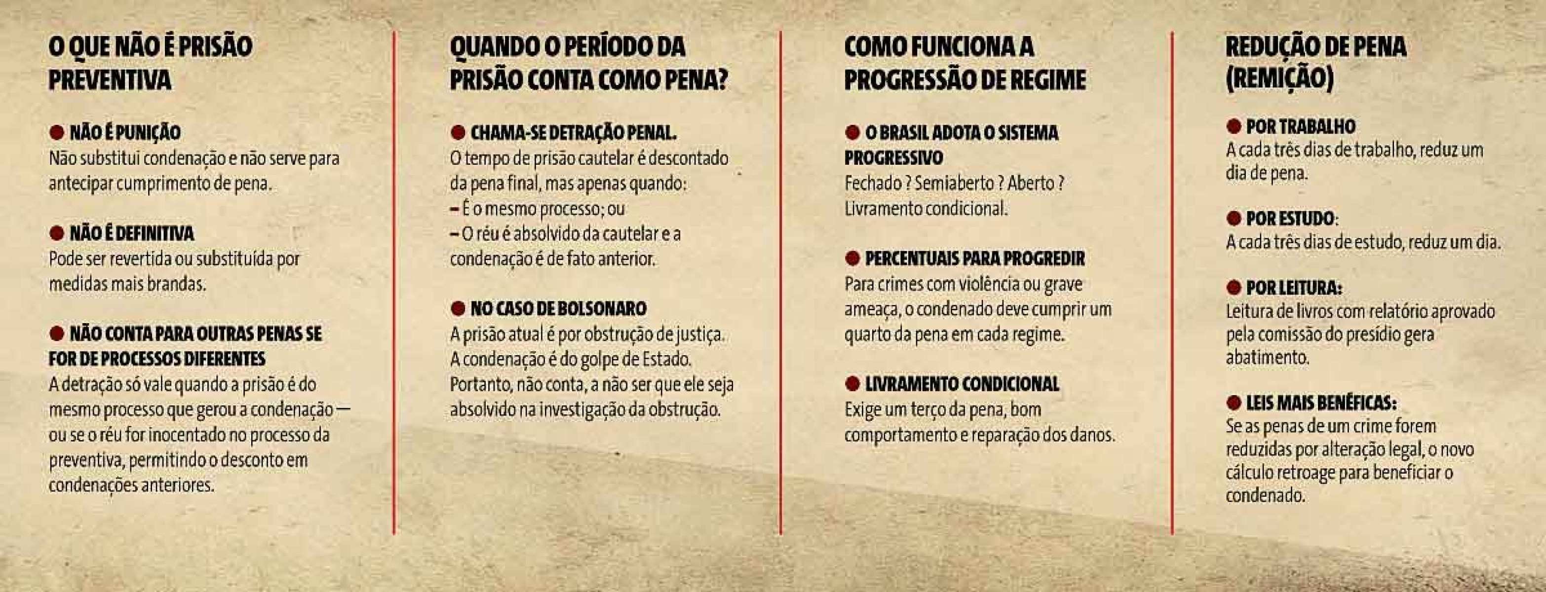 O criminalista Rafael Paiva explica que, caso a condenação do golpe de Estado transite em julgado, Bolsonaro seguirá o rito comum de execução. “O cumprimento da pena se dará em presídio comum, possivelmente a Papuda, mas em cela separada dos demais presos.”