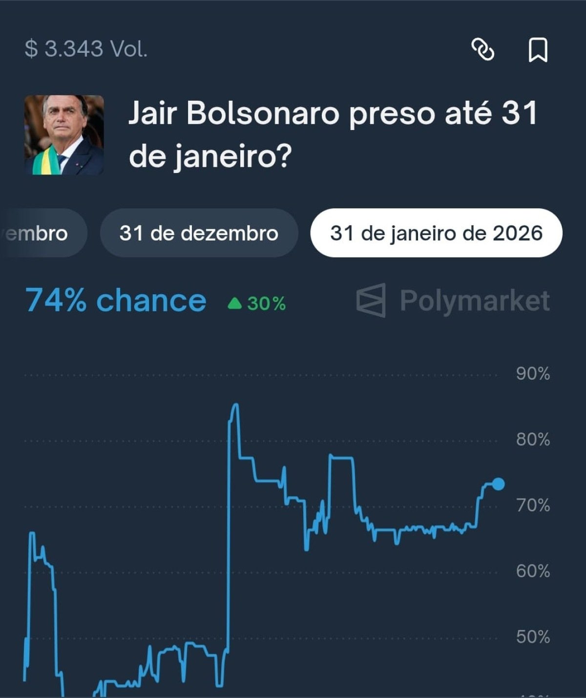 Para os apostadores, a maior probabilidade (74%) é que o ex-presidente seja preso até essa data. Outros 67% apostaram que ele pode ser levado para a prisão até 31 de dezembro, e apenas 13% acreditam que ele seja preso até o fim deste mês.