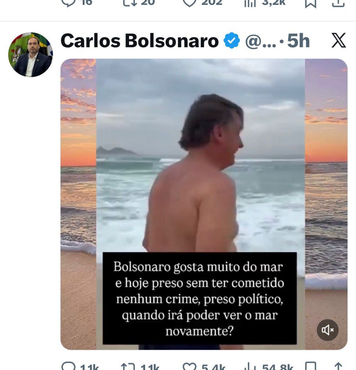 O ex-vereador Carlos Bolsonaro (PL-RJ) usou as redes sociais para comentar a prisão do ex-presidente Jair Bolsonaro (PL). Em publicação, afirmou que o pai “gosta muito do mar” e questionou “quando poderá ver o mar de novo”, em referência ao período em que Bolsonaro permanece na cadeia.