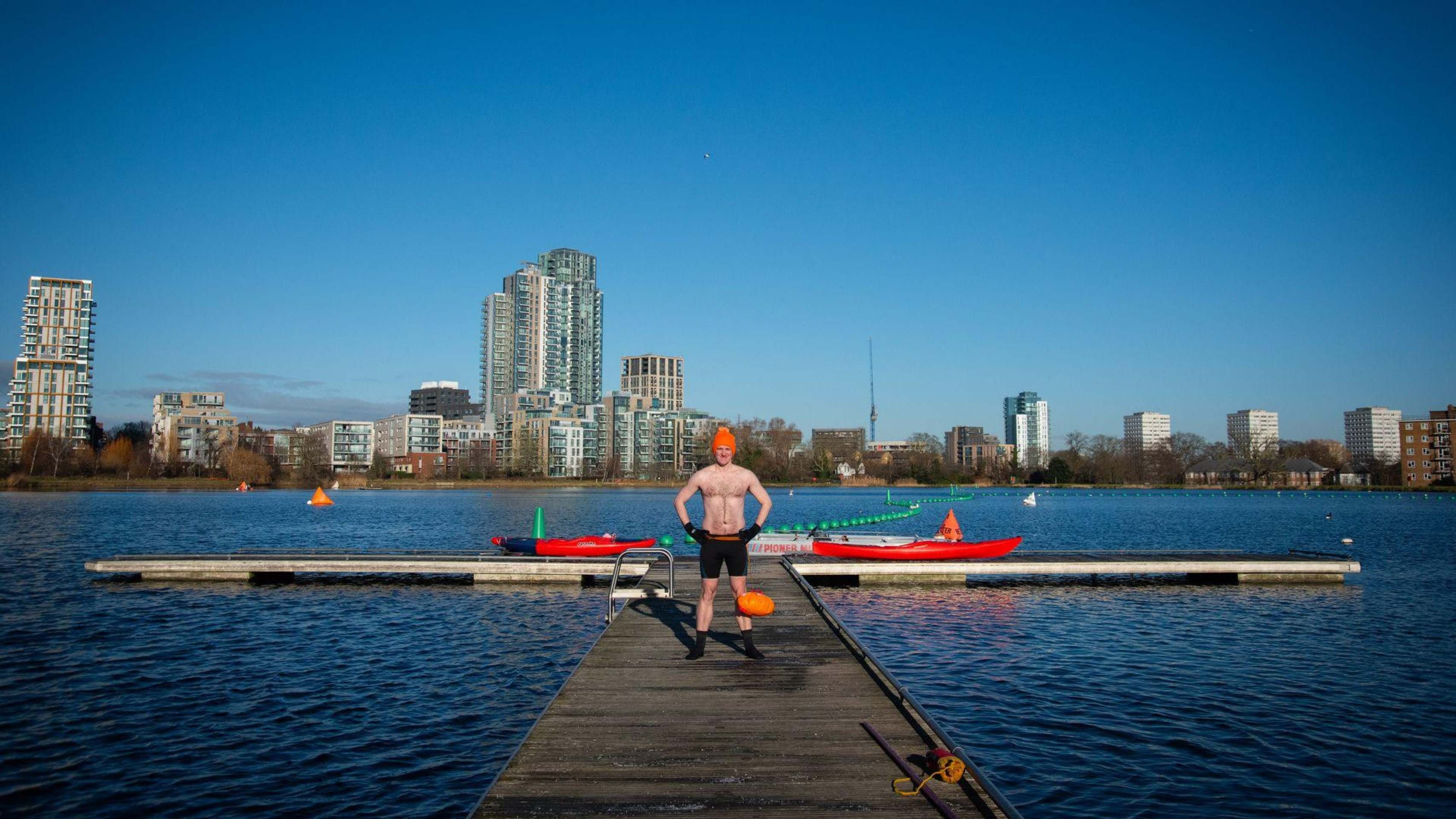 Uma placa com cores brilhantes me informa que a temperatura da água hoje é de 3,9 °C, enquanto um dos frequentadores me diz que isso não é natação em água fria — é "natação em gelo".