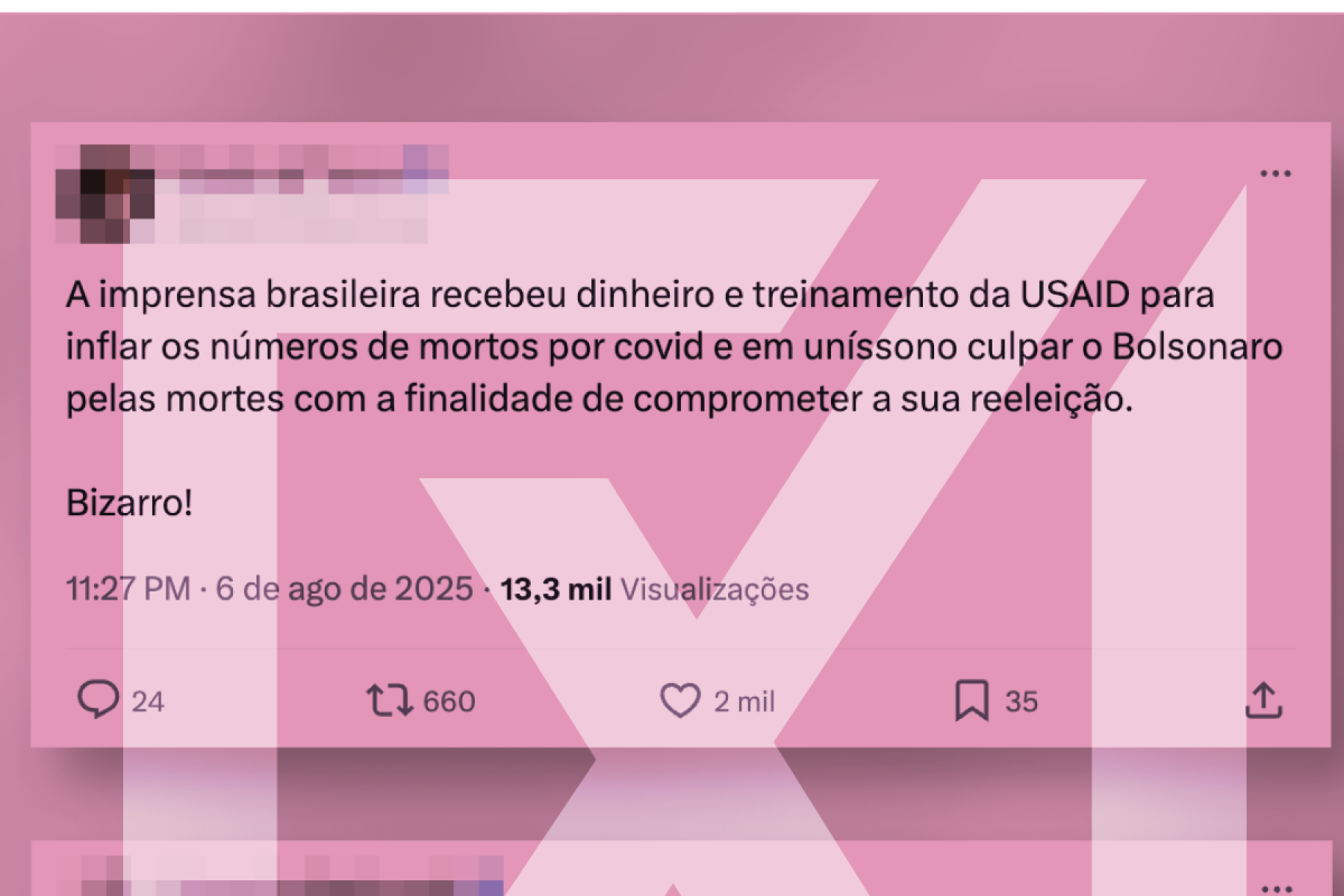 Não há registro de nenhuma transferência de dinheiro da Agência dos Estados Unidos para o Desenvolvimento Internacional, a USAID, para veículos de imprensa brasileiros. Uma postagem no X engana ao afirmar que a USAID “pagou para a imprensa aumentar os números de mortes” de covid-19 no Brasil. A acusação é uma referência ao consórcio de veículos de imprensa criado em 2020 para divulgar os dados da pandemia no país, mas ela não se sustenta. A coleta de dados era feita diretamente com as secretarias de saúde estaduais e os números batem com o que foi divulgado pelo governo federal.
