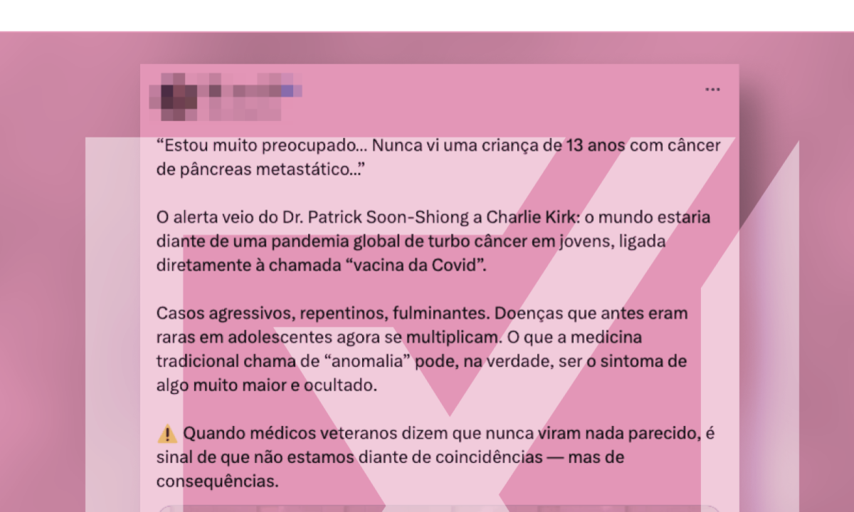 Siga noPost no X desinforma ao dizer que estaria ocorrendo uma “pandemia global de turbo câncer (sic) em jovens”. A publicação usa trecho do programa “The Charlie Kirk Show” de 3 de junho, em que o influenciador Charlie Kirk, assassinado em 10 de setembro, conversa com o médico e empresário Patrick Soon-Shiong. Nele, Soon-Shiong diz estar vendo pela primeira vez “criança de dez anos com câncer de cólon”, “um adolescente de 13 anos com câncer pancreático metastático” e casos de câncer de ovário em “jovens de 20, 21 anos”, e chama isso de “turbocâncer”. O médico associa o problema, entre outros pontos, à covid-19 e às vacinas de prevenção da doença.