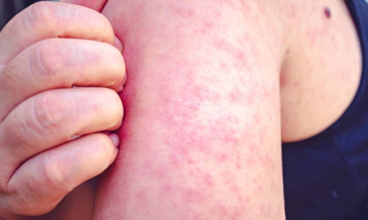 manchas avermelhadas que começam no rosto e se espalham pelo corpo;