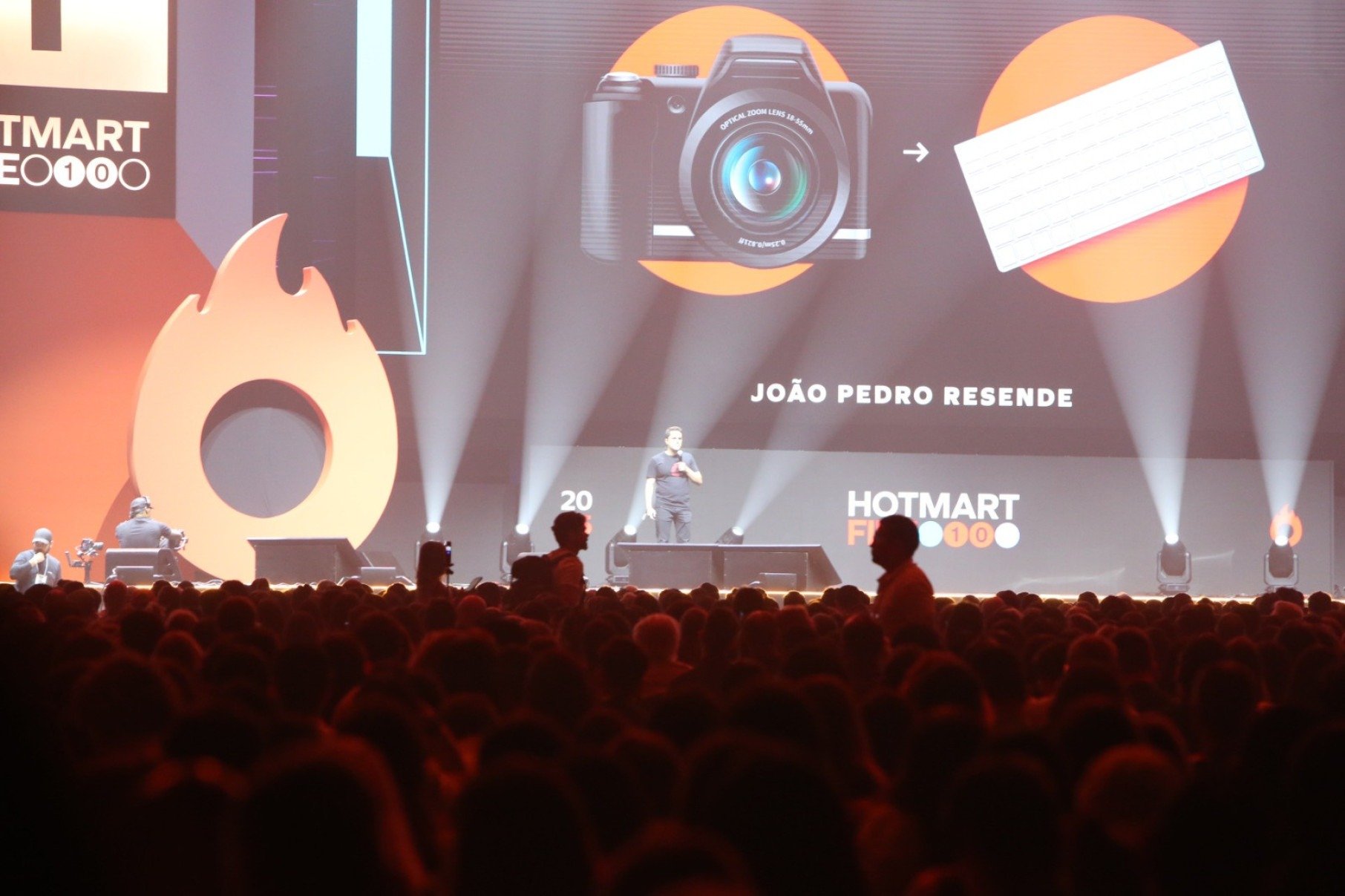No palco principal, João Pedro Resende, CEO e cofundador da Hotmart, abriu o evento detalhando como agentes de inteligência artificial podem potencializar produtos digitais na plataforma. Ele explicou a lógica de escalabilidade das ofertas digitais: