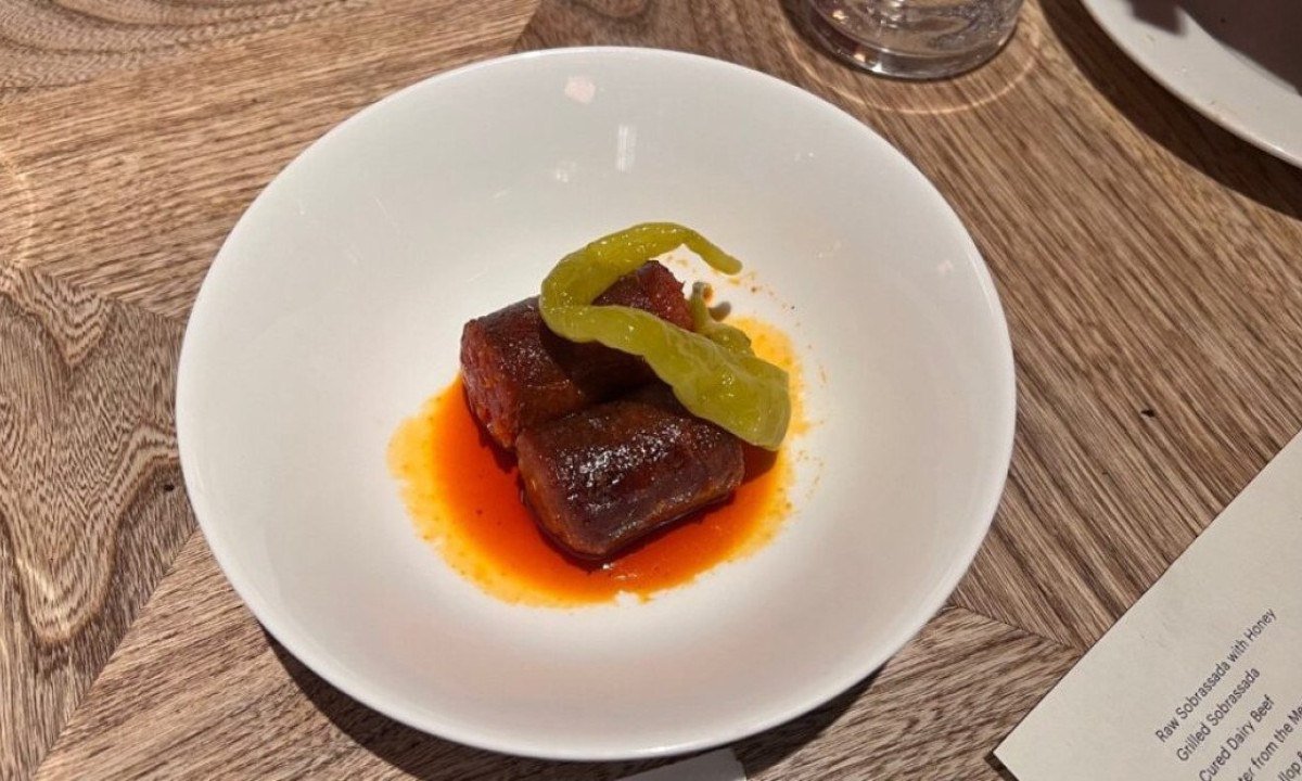 Carne curada em finíssimas fatias (cured dairy beef), crudo de peixe (raw scallop & monkfish), linguiça temperada com sal e páprica (sobrassada), tudo isso acompanhado de caldos e reduções impecavelmente equilibrados. Sabores que a todo instante nos remetia a intensidade da culinária espanhola e seus toques a mais.