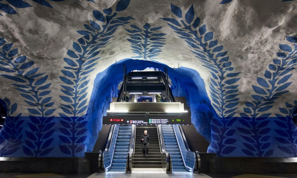 O metrô de Estocolmo é frequentemente chamado de "a galeria de arte mais longa do mundo", e a T-Centralen é sua estação mais famosa. Para evitar a sensação de confinamento, os arquitetos optaram por deixar o leito rochoso exposto, tratando as paredes da caverna como uma tela gigante.
